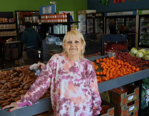 Volunteers like Deb help shoppers at Bountiful Basket pick out their groceries.